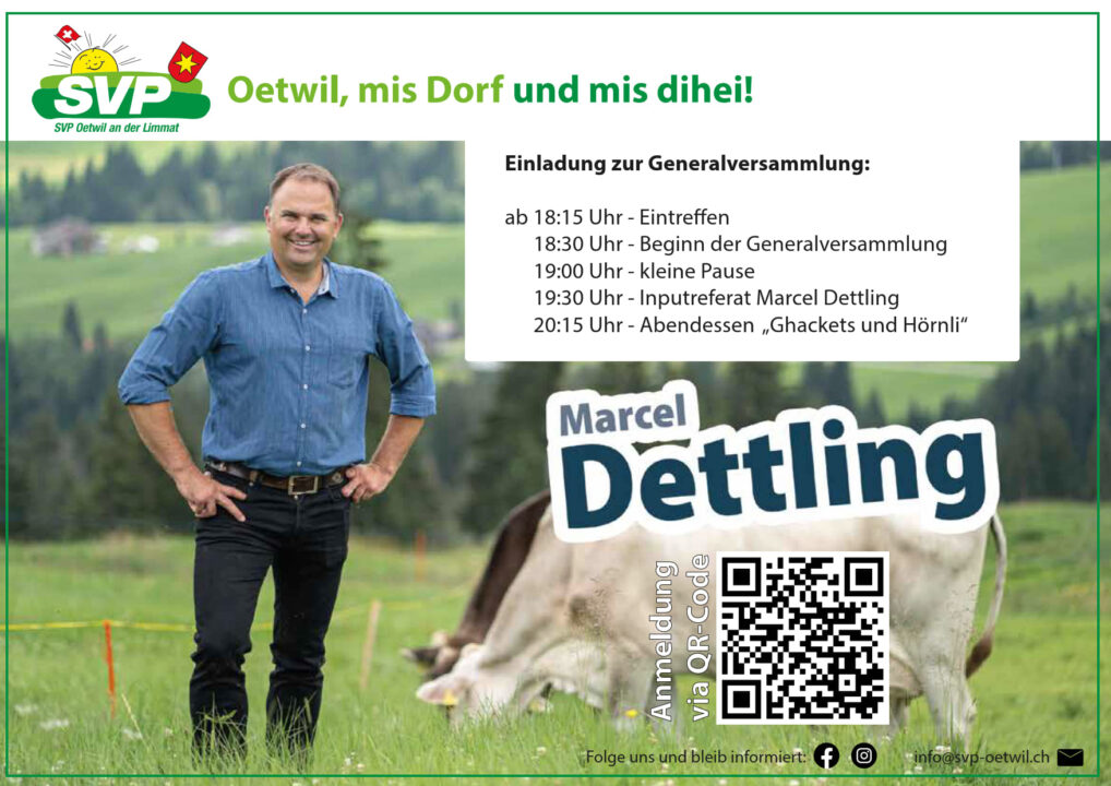 Wir freuen uns riesig, Marcel Dettling bei uns in Oetwil begrüssen zu dürfen! Er wird ein interessantes Referat zu aktuellen Themen halten mit anschliessendem Abendessen.