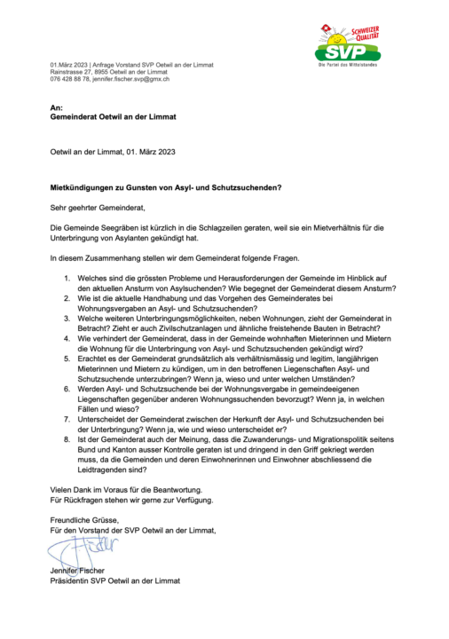 Der Vorstand möchte Euch darüber informieren, dass wir als Partei bei der Gemeinde einen Antrag gestellt haben, um über die aktuelle Asylpolitik im Dorf informiert zu werden.
